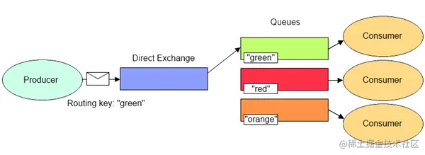 Direct Exchange 是 RabbitMQ 默认的 Exchange,完全根据 RoutingKey 来路由消息。设置 Exchange 和 Queue 的 Binding 时需指定 RoutingKey(一般为 Queue Name),发消息时也指定一样的 RoutingKey,消息就会被路由到对应的Queue。