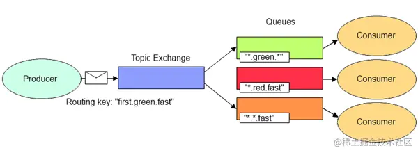 Topic Exchange 和 Direct Exchange 类似,也需要通过 RoutingKey 来路由消息,区别在于Direct Exchange 对 RoutingKey 是精确匹配,而 Topic Exchange 支持模糊匹配。分别支持 * 和 # 通配符,* 表示匹配一个单词, # 则表示匹配没有或者多个单词。