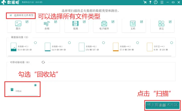 步骤3:在主界面,选择你需要进行扫描的文件类型,若是要恢复的文件类型较多样,可以勾选【选择所有文件类型】,并选择【回收站】 ,点击【扫描】;