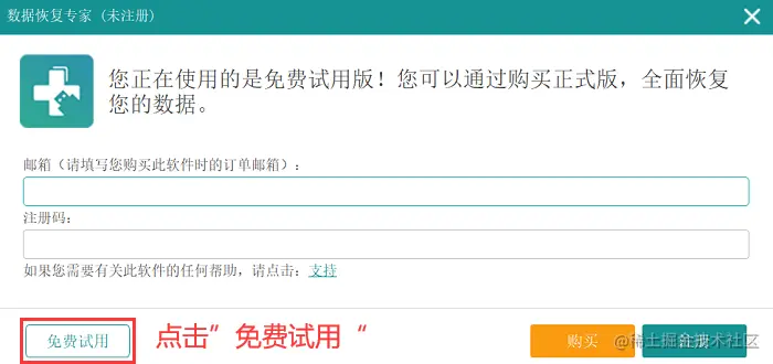 步骤2:运行软件,在看到 【免费试用】 提示时,点击它即可获得免费扫描体验;