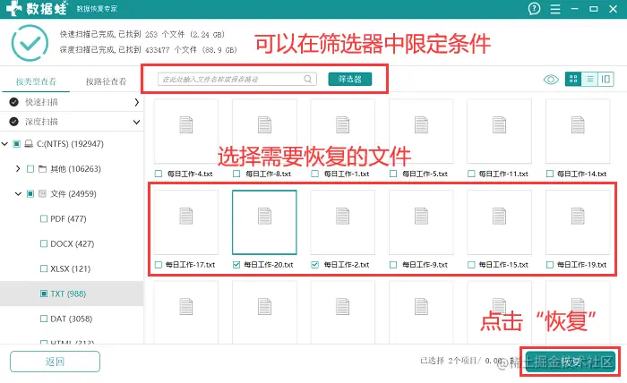 步骤5:在扫描结束后,利用 【筛选器】 限定需要恢复的文件条件,这样可以有效减少文件查找时间,并对所有需要恢复的文件进行选择后单击 【恢复】 ,将文件保存在与扫描时不同的位置即可。