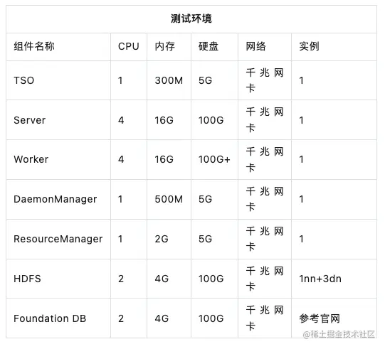 用户需要购买和部署自己的Kubernetes集群,建议在不影响性能前提下,测试环境的硬件配置,以10G数据TPCDS测试的如下表1参考配置,其中Foundation DB的配置可以参考官方文档;生产环境建议表2的硬件配置,但也需要根据数据量和查询要求自由调节配置。
