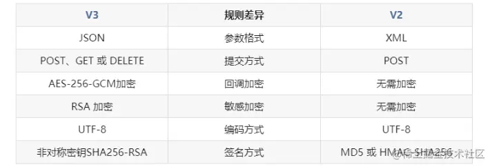 可以看到 ①v3 已经放弃了你们常见的MD5 而改用最新的RSA+SHA256(俗称RSA2加密方式)②v2的所有返回结果都是明文的xml v3改成了加密后的json但是需要解密后才能拿到真正的返回值(解密算法AES-256-GCM)