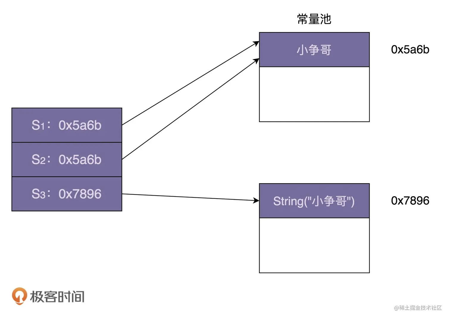 String 类利用享元模式来复用相同的字符串常量(也就是代码中的“小争哥”)。JVM 会专门开辟一块存储区来存储字符串常量,这块存储区叫作“字符串常量池”。上面代码对应的内存存储结构如下所示: