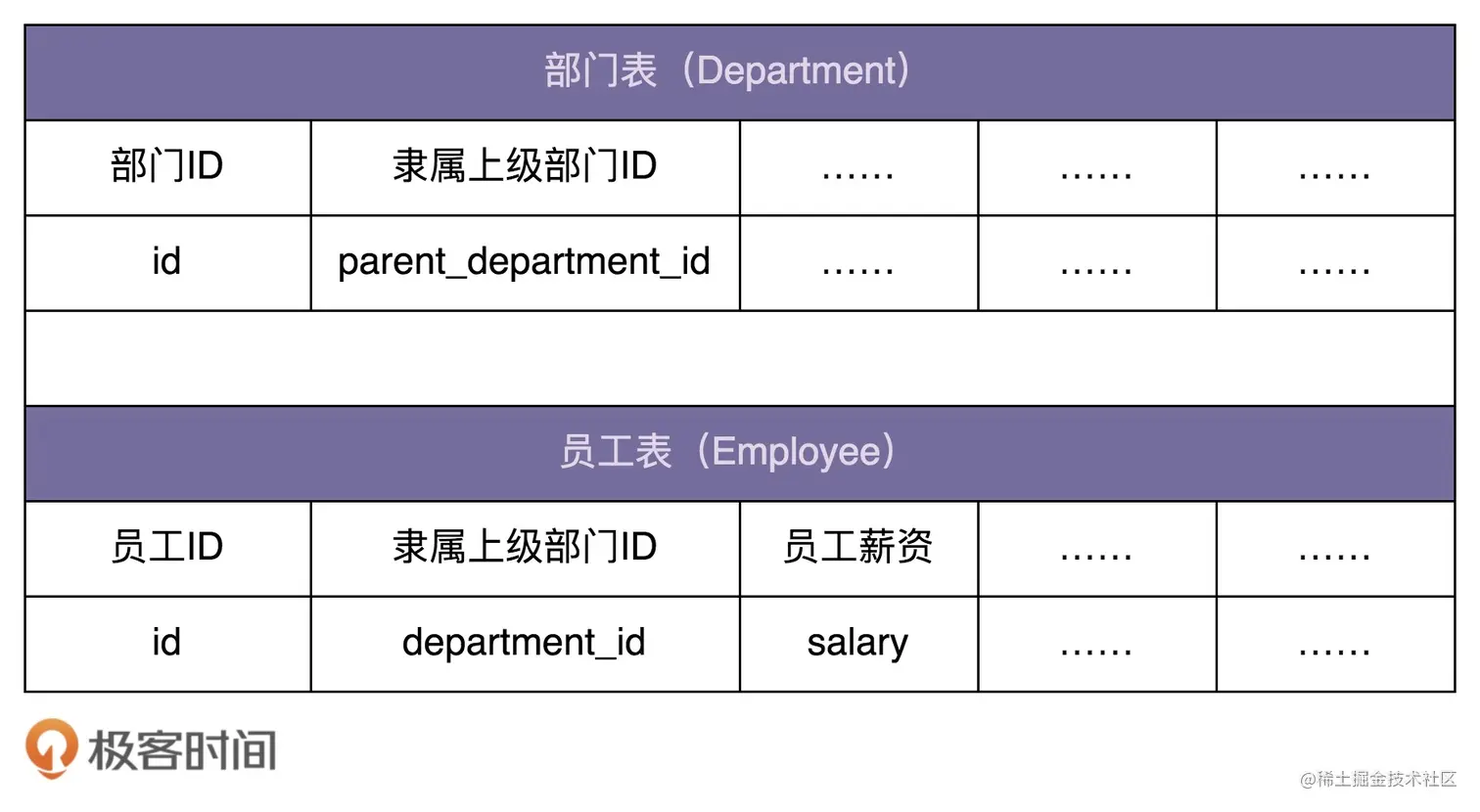 假设我们在开发一个 OA 系统(办公自动化系统)。公司的组织结构包含部门和员工两种数据类型。其中,部门又可以包含子部门和员工。 在数据库中的表结构如下所示: