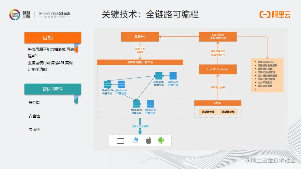 为此我们开发了全链路可编程系统,对流媒体传输和流媒体处理都进行了可编程扩展,把C代码进行原子能力的抽象,抽象到相应Lua的API,通过调用这些API,可以组合出各种不同的业务能力,以满足播放行为、时间戳、QoS算法迭代以及转码动态规则调整等需求。Lua代码实现以后,会通过配置中心传输到流媒体的传输网络和处理网络,以满足新功能或优化快速迭代的需求。