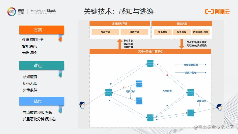 这里面有三个难点,一是感知的速度,我们采用了两种手段,一方面做业务分级,对系统资源利用率非常大的数据,会使用高优先级通道传输;另一方面进行节点上的计算,将很多计算,包括评分,放在节点上完成,这样传输的数据会大幅减少,从而提升传输速度。第二个难点是如何实现无损切换,要保证音视频的无感切换需要进行帧级别的续接,同时也要处理时间戳连续性、分布式系统调用异常等细节。第三个难点是如何做决策,因为拥有大量的信息,而不同的业务对质量的要求又不尽相同,如何进行智能决策,同时又满足成本的需求,就存在着很大的挑战。