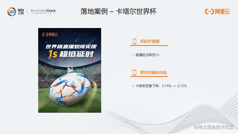 在卡塔尔世界杯期间,我们支持了超低延时的直播,将端到端直播延时降低到一秒以内。此外,我们还带来了更好的播放体验,卡顿率显著下降,从3.19%降低至2.13%。