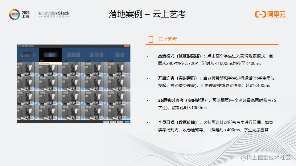 云上艺考则综合使用了多项能力。在远程监考场景,当老师对一个学生感兴趣时,可以单击进入电视直播模式,达到400毫秒延时的直播。如果老师有问题需要和学生进行沟通,开启连麦,也可以做到400毫秒之内的通信。同时,媒体处理服务可以对这些流进行实时的合流,形成一个老师面对多个学生的画面。另外,基于数据传输的能力,应用层可以实现口播的功能,将数据通过网络传给学生,进行考场规则的宣读与显示。