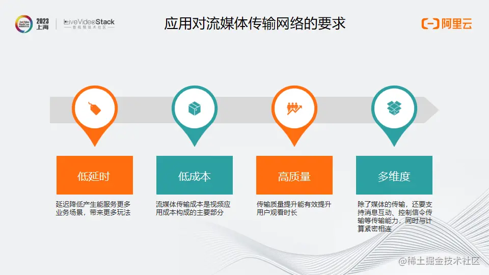 综合来看,应用对流媒体传输网络的要求来自于四个方面:第一,延时的降低可以催生更多业务场景;第二,低成本,媒体传输是视频应用成本的重要组成部分;第三,更高质量的视频可以提升用户的观看时长;第四,多维度,除了媒体传输之外,还需要支持互动消息的传输、控制信令的传输,同时也要支持与计算的紧密相连。