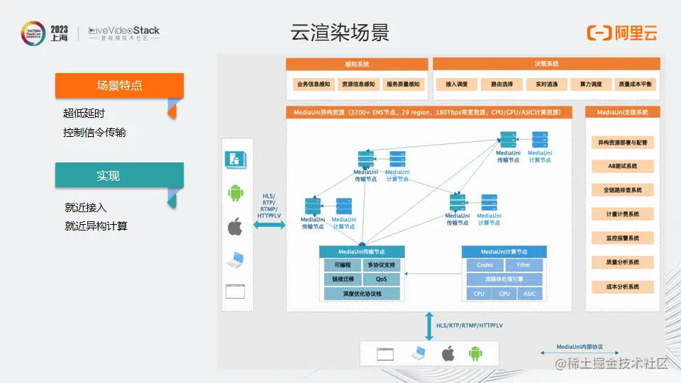 在一些云渲染的场景,通过就近传输和就近处理,我们实现端到端延时降低到58毫秒。目前,这项技术已经应用在央博的云庙会,以及去年双11淘宝未来城中。