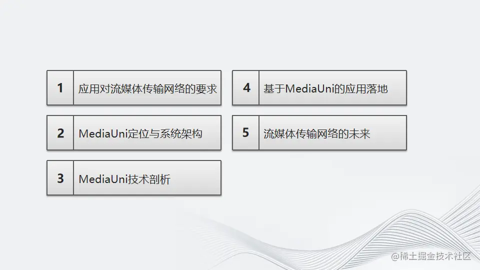 下面我将会从应用对流媒体传输网络的要求、MediaUni定位与系统架构、MediaUni技术剖析、基于MediaUni的应用落地和流媒体传输网络的未来5个方面展开介绍。