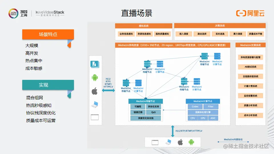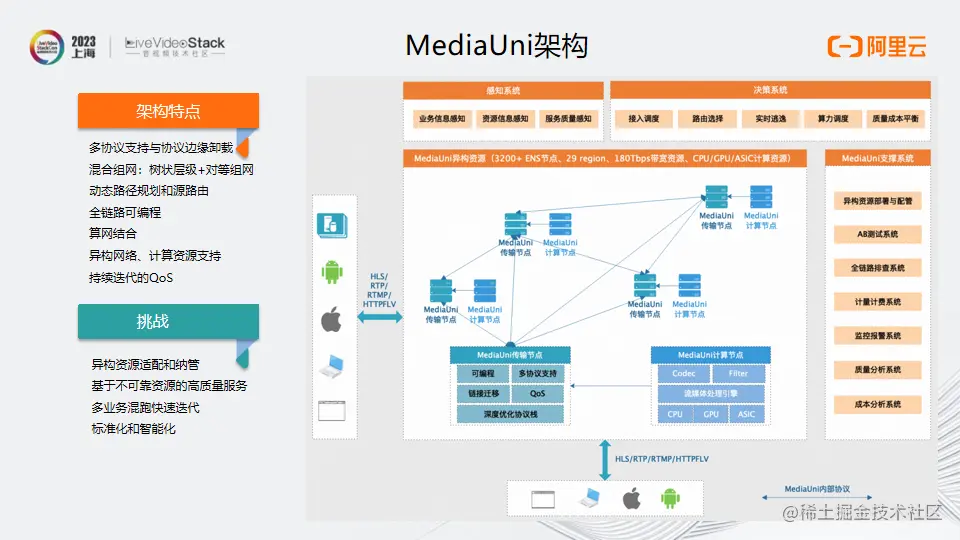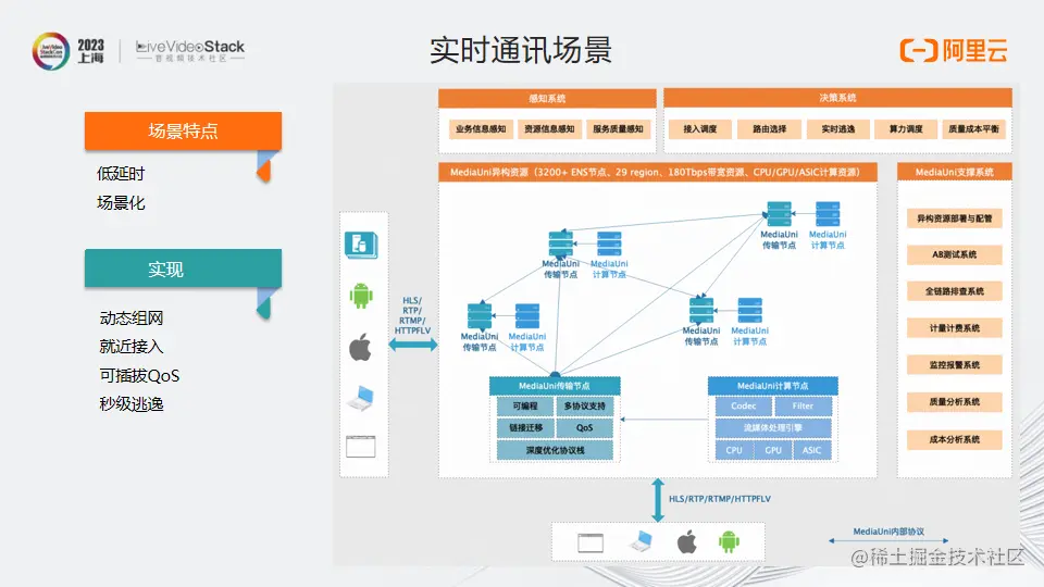 可以看到,MediaUni构建在阿里云广泛的异构资源上,包括3200+的边缘计算节点,以及29个region,同时也包括超过180T的带宽,涉及的计算资源类型包括CPU、GPU、ASIC。
