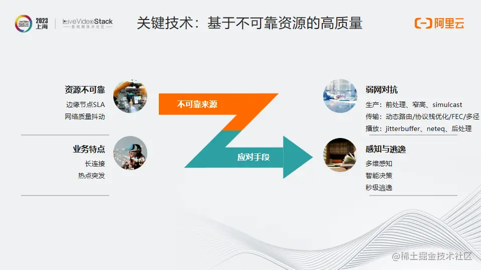 针对上述问题,我们进行了两方面的优化。一方面是弱网对抗。从生产端到传输端,再到播放端,会有很多的优化策略,例如,在前处理时进行降噪、通过阿里云窄带高清技术降低码率、支持多流、SVC等;传输侧相应的策略有动态路由、协议栈优化、FEC、多径等;播放侧会有jitterbuffer、neteq、后处理等方式。