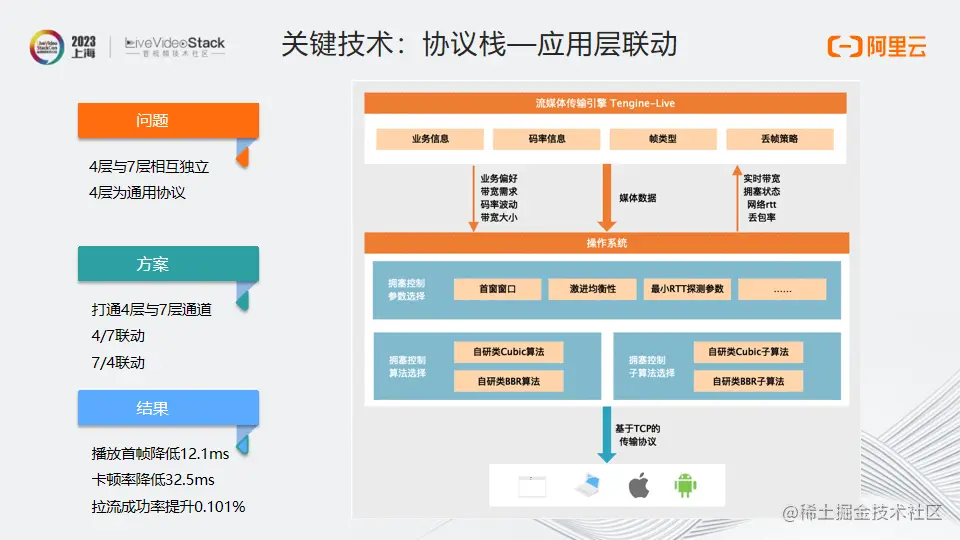 相应的传输信息也会通过4层到7层的通道,把底层拥塞控制里面的实时带宽、网络拥塞状态、网络RTT丢包率等信息传递给应用层,如果应用层发现底层网络已经严重拥塞,则可以采取更激进的丢包策略。