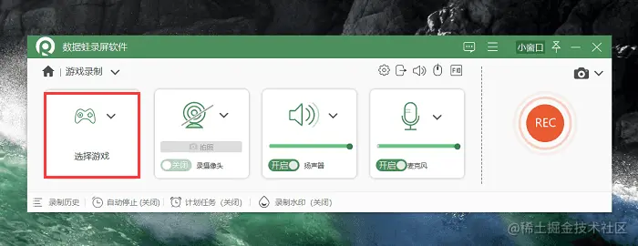 第2步:进入游戏录制页面,在这里我们可以设置摄像头、扬声器和麦克风,然后选择需要录制的游戏。