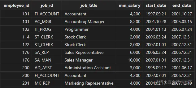 查找各职员的工作历史信息, 测试各类型的表进行关联查询的兼容性情况。
