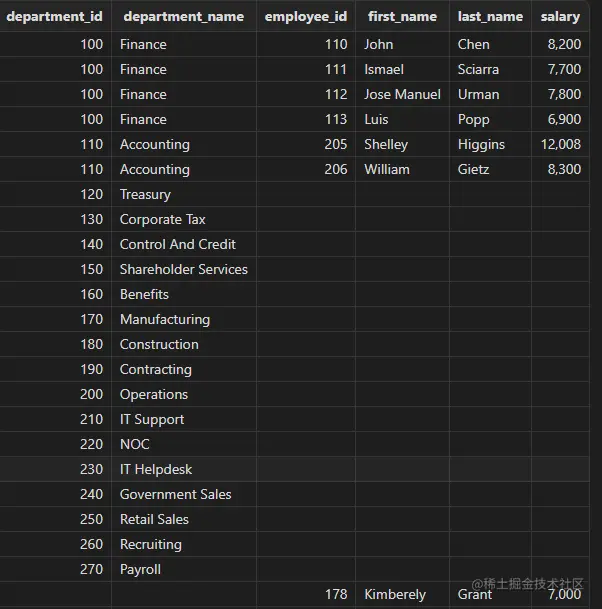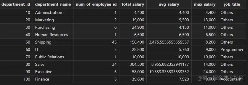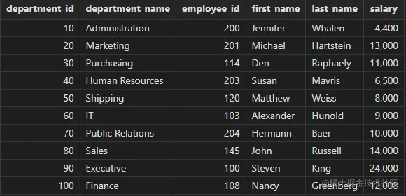 下面示例以 Oracle模式按部门统计职工薪水情况,包括部门信息、职工人数等: