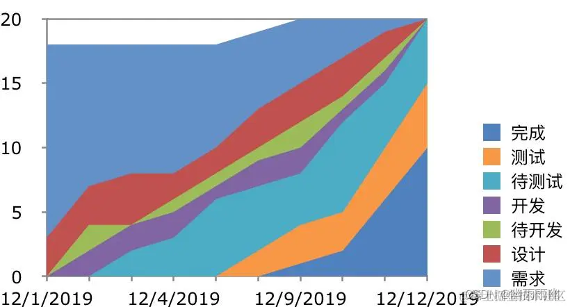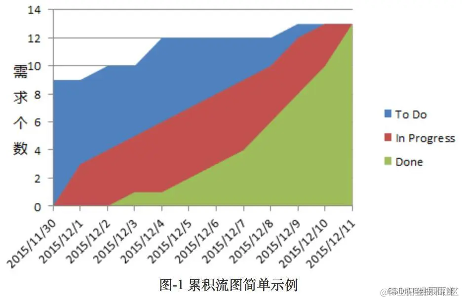 累积流图是在排队理论里使用的一个工具。它是一个面积图(如下图-1所示),强调用户故事或是需求数或是工单数随时间而变化的程度,同时直观显示整体趋势走向。X轴代表时间,Y周代表需求数量或是bug数或是用户故事数(可根据实际情况来定义)。