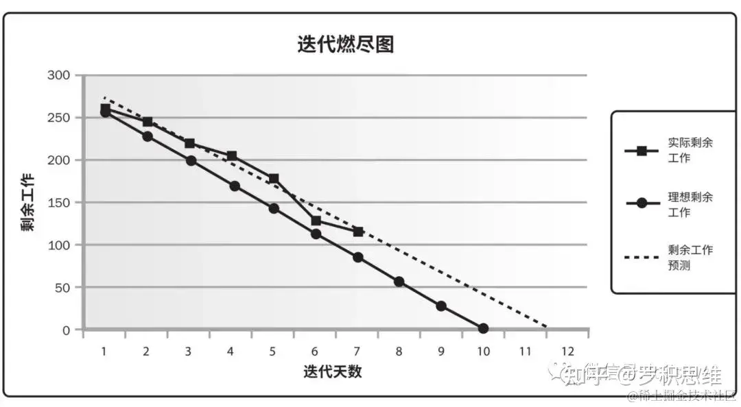 ●在燃尽图中,先用对角线表示理想的燃尽情况,再每天画出实际剩余工作,最后基于剩余工作计算出趋势线以预测完成情况