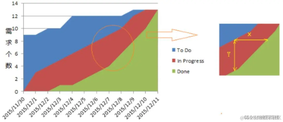 如上图所示,其中范围线代表项目待办的工作;开发完成线代表研发同学已完成开发的工作;而测试完成线代表测试通过后具备上线条件的工作;而开发完成和测试完成之间的差距就是待测试部分的工作