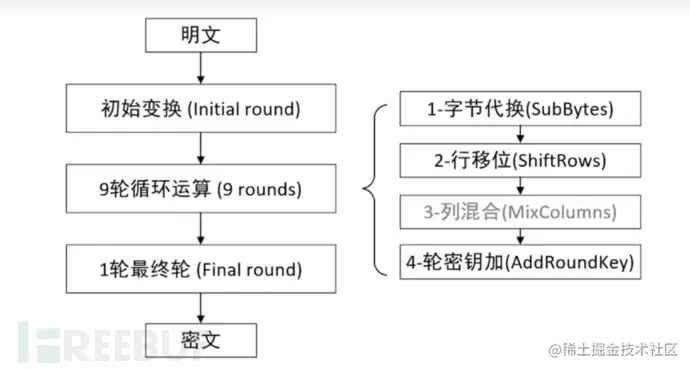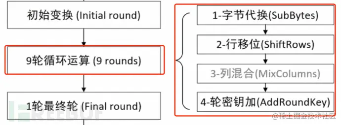 1. 加密过程:最后一组“1轮最终轮(Final round)”中不存在右边的“3.列混合(MixColumns)”。