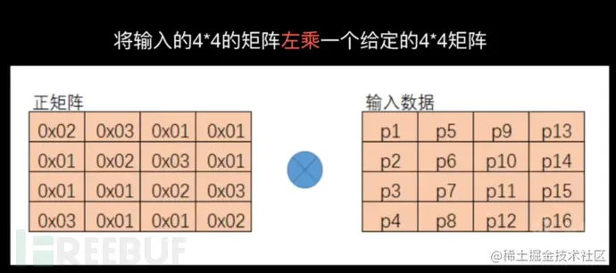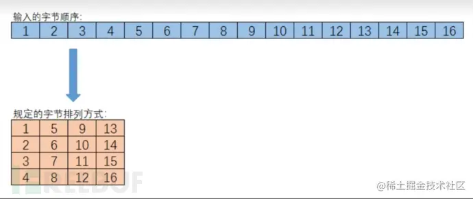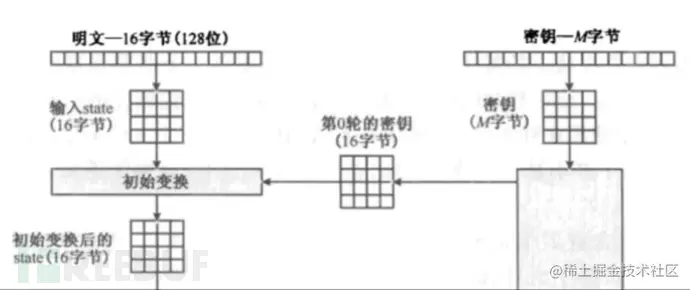 2. 初始变换:明文128位转换为16字节的矩阵如下,再与128位的秘钥(同理转换为16字节的矩阵)进行异或,得到第一次转换后结果。