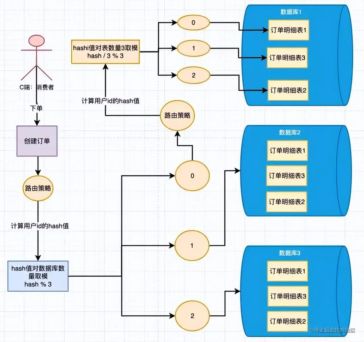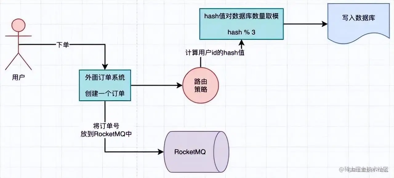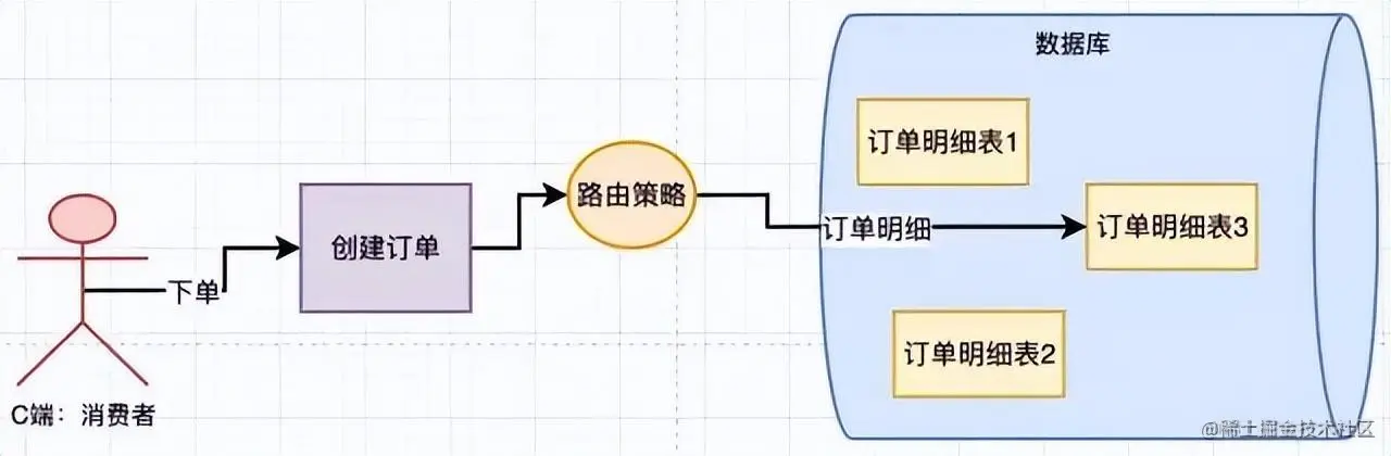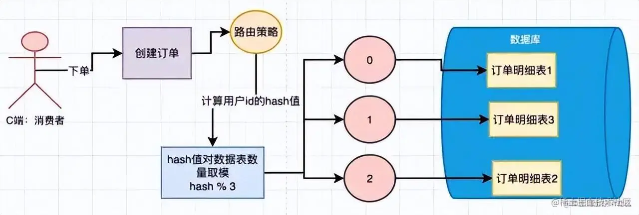 在单库的情况下,用户下单,生成一个订单,把用户id作为路由key,对user_id取hash值然后对表的数量进行取模,得到对应需要路由的表,然后写入数据。