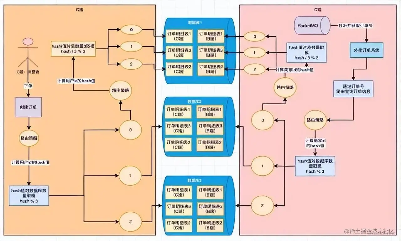 用户的角度以user_id作为路由key,商户的角度以商家id作为路由key。商家是如何通过路由key路由数据的呢。游湖在下单的时候把队友的订单号发送到MQ里,商家可以去消费这个MQ,然后根据订单号获取订单信息,然后再把订单信息插入到商户的数据库表当中。商户的路由策略和用户的路由策略是一样的。