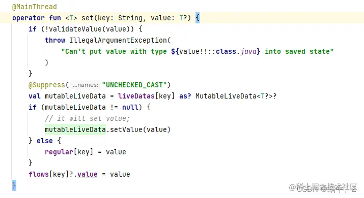 通过数据保存,我们会发现,set的时候没有LiveData类型,那是因为在set的方法时,会对livedata集合进行单独处理