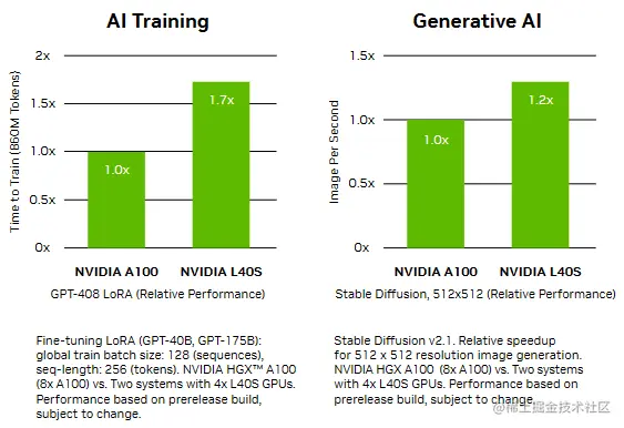 对于具有数十亿参数和多种模态的生成式 AI 工作负载,L40S 相较于老前辈 A100 可实现高达 1.2 倍的推理性能提升,以及高达 1.7 倍的训练性能提升。