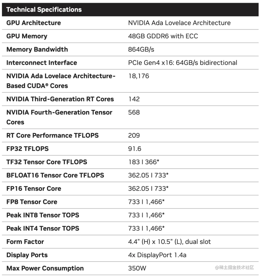 基于 Ada Lovelace 架构的 L40S,配备有 48GB 的 GDDR6 显存和 846GB/s 的带宽。