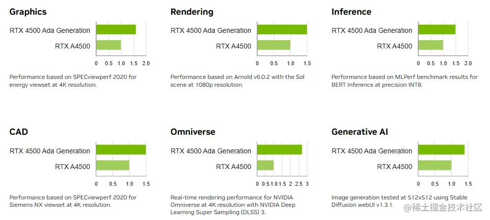 RTX 4500 配备了 24GB 显存,7680 个 CUDA 核心,240 个 Tensor 核心,60 个 RT 核心。