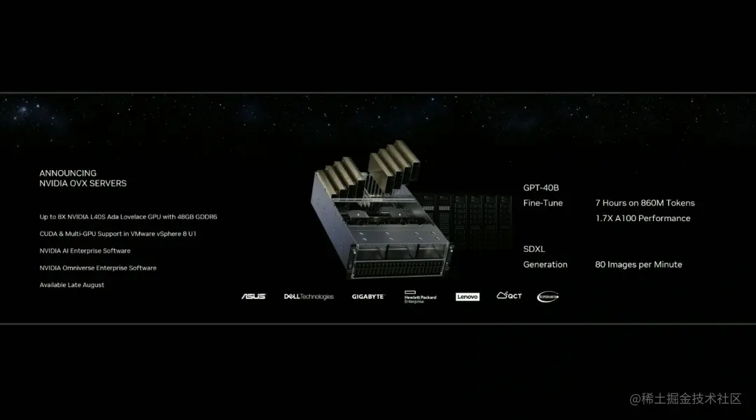 在 L40S GPU 的加持下,老黄又针对数据中心市场,推出了最多可搭载 8 张 L40S 的 OVX 服务器。