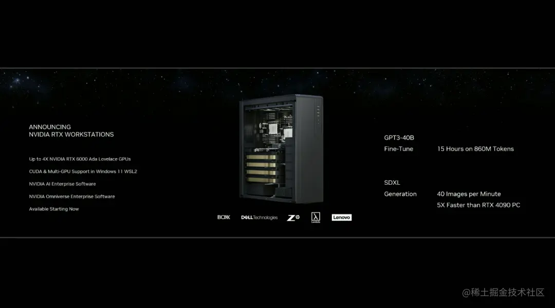 支持最多 4 张 RTX 6000 GPU,可以在 15 小时内完成 8.6 亿 token 的 GPT3-40B 的微调。