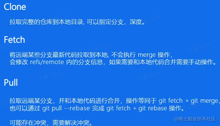 将 Git 完整的视图描述一遍,重新强调 git 是怎么存储代码历史的。讲完了 Git 本地的存储方式, 引出多人合作和远端仓库同步的概念,从而进入到 Git Clone Pull Fetch 的内容