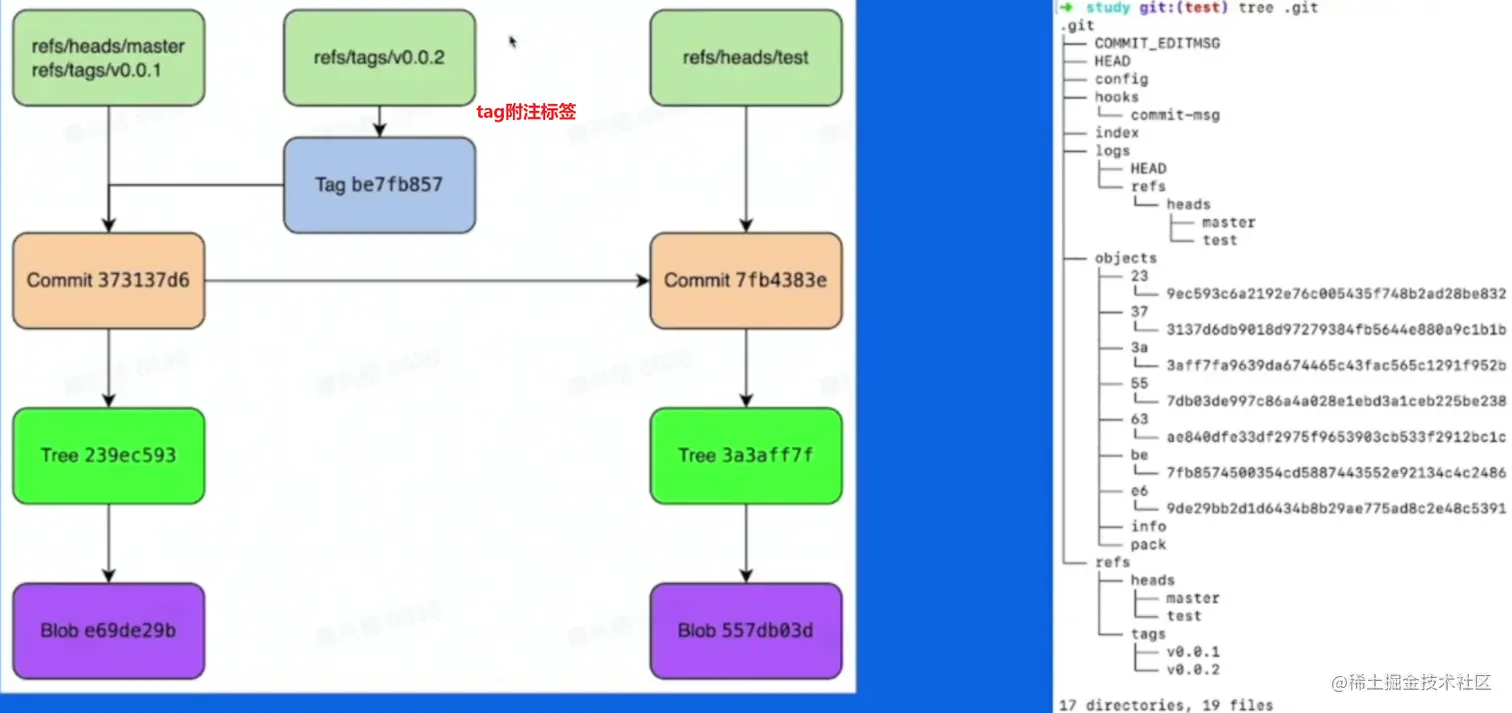 HEAD 表示当前指向的分支;config 当前仓库的配置;hooks 配置hook Object 存储文件信息; refs 存储分支信息;