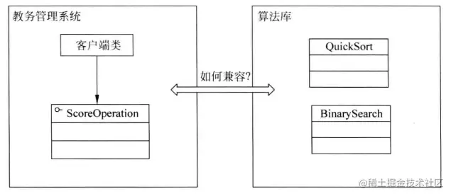 - 由于两个系统是独立开发的,在开发过程中没有进行过协调,ScoreOperation接口中现有的代码无法直接调用算法库中的算法。例如:ScoreOperation中排序的接口名为sort,而算法库中快排的接口名为QuickSort,二者不匹配,无法直接调用。若要调用算法,只能去修改接口中的代码,而这又不是我们所期待的