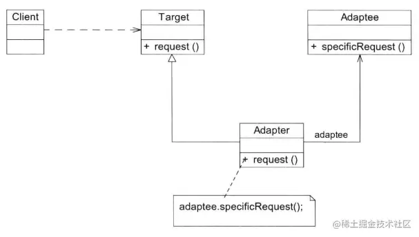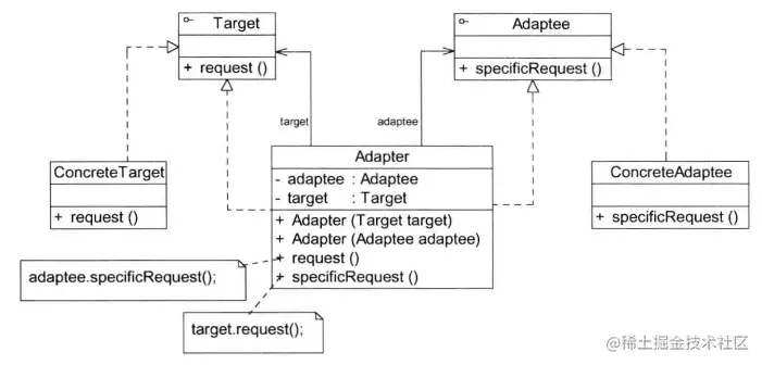 从结构图中可以看到,客户端调用Target类的request方法,而Adaptee类中没有该方法,只有实现相同功能的specificRequest方法,适配器Adapter类的作用就是将对request方法的调用转化成对specificRequest方法的调用
