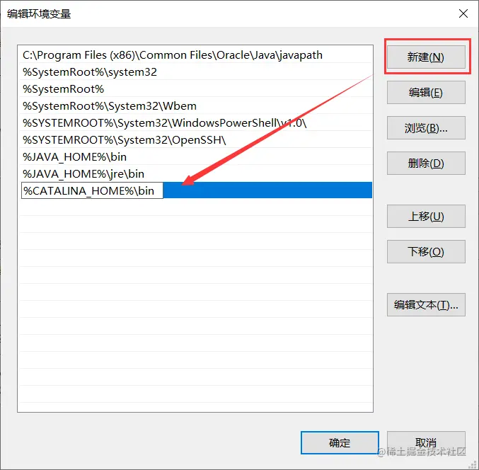 之后点击新建,输入%CATALINA_HOME%\bin。如图,再点击确定: