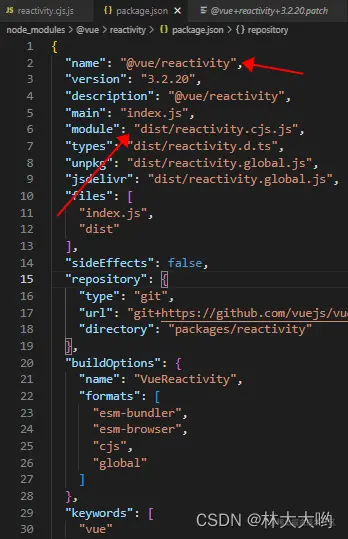 在终端输入 npx patch-package package-name,就可以看到在项目里新增了一个patches文件夹,那里面就是新增的补丁文件,这个package-name 就是你对应依赖的名字,切记这个名字是你依赖里的package.json的name,比如下图依赖名就是@vue/reactivity,此时你就输入下面指令(使用npx的话注意npm版本要大于5.2噢)