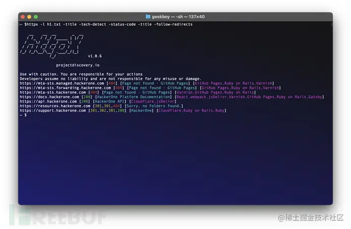 ▶ subfinder -d hackerone.com | httpx -title -tech-detect -status-code -title -follow-redirects