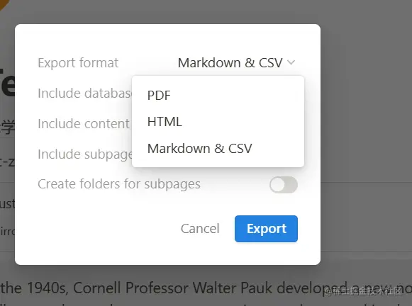其实我最早基本只会在notion用一下markdown,notion支持导出markdown,还支持转换成pdf,markdown,html,csv格式,也就是说你只要会写word,就可以通过导出文档生成markdown文件,不用花时间学,但是我不太建议,毕竟markdown也不难,十几分钟就能学会。