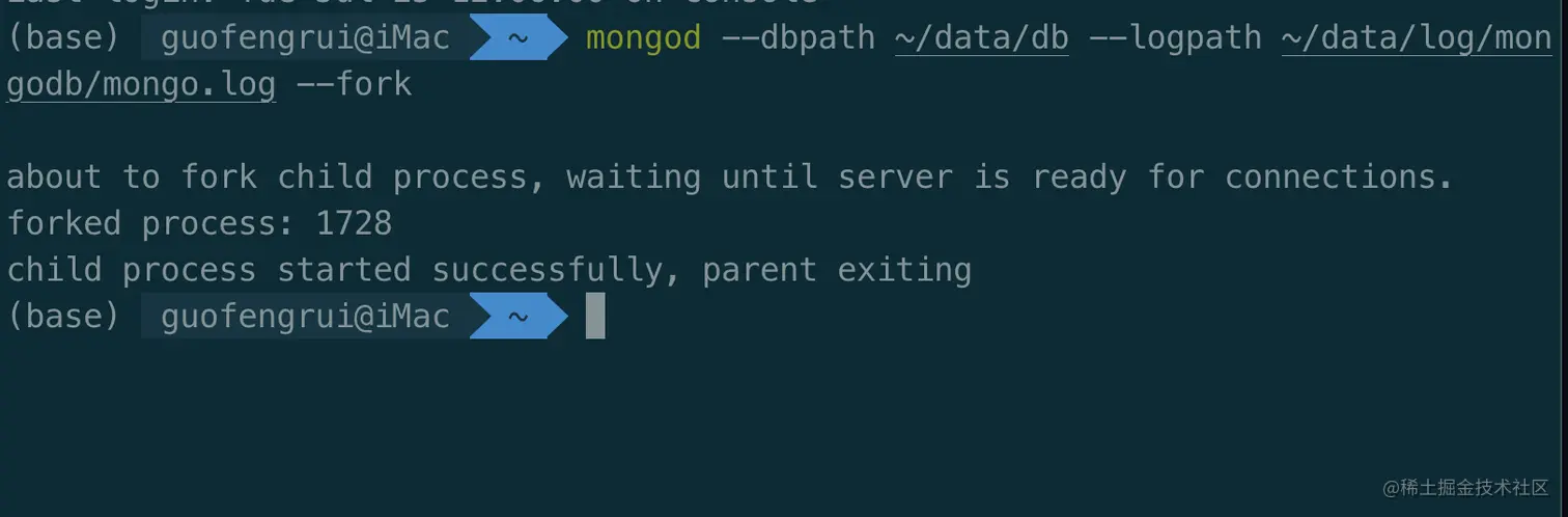 mongod --dbpath ~/data/db --logpath ~/data/log/mongodb/mongo.log --fork