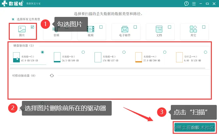 2.在软件中,勾选 【图片】( 如果需要恢复其他类型的文件,也是直接勾选即可),并选择图片删除前所在的驱动器,单击 【扫描】 ;