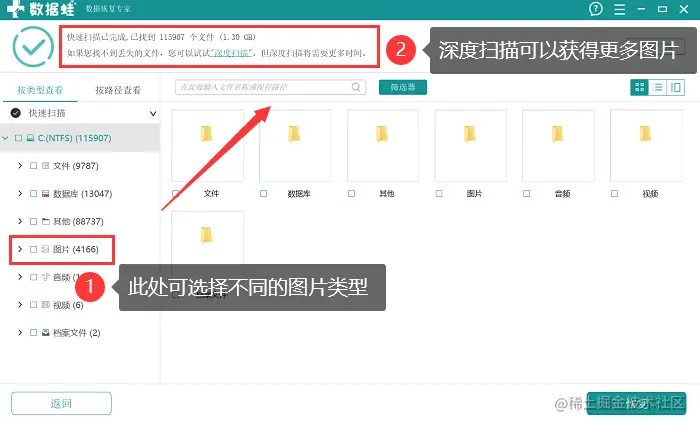 3.第一次扫描结束之后,可以按类型查看你需要的照片,在查看后,如果需要恢复的照片展示不齐全,点击 【深度扫描】 并耐心等待;