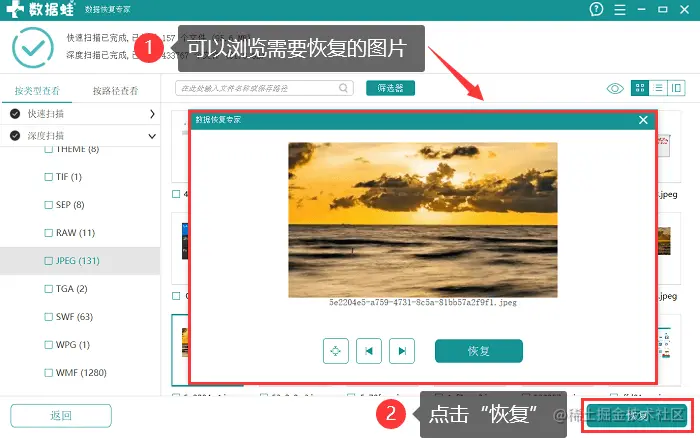 4.深度扫描结束后,可以利用 【筛选器】 对图片进行条件限定,找到需要恢复的文件后,如果不确定,可以放大浏览图片,确认是需要恢复的图片之后,将其勾选上,点击 【恢复】 并等待即可。
