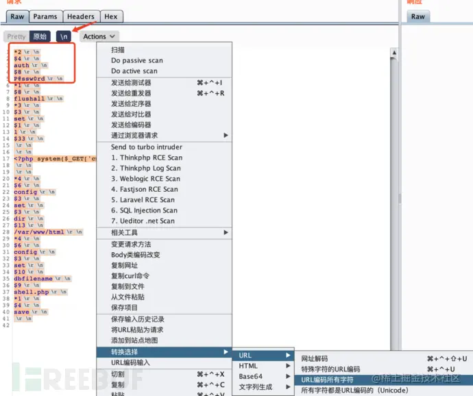 7. 将gopher://127.0.0.1:6379/_后面的payload进行url解码后,在上方添加验证密码并增加换行,然后进行两次url编码。