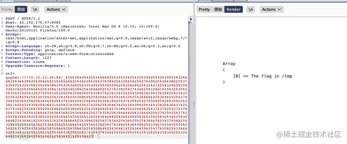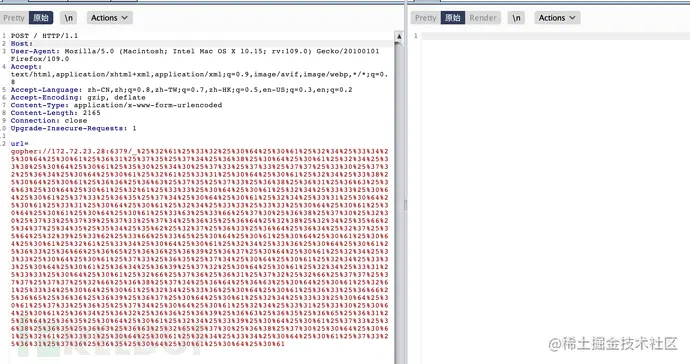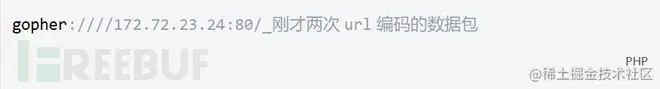 2. 这里是post请求,需要利用gopher协议发送post请求。此处要求必须有4个参数为必要参数,用于传递Content-Type,Content- Length,host,post的参数。如果有多个参数,则参数之间的&也需要进行URL编码。