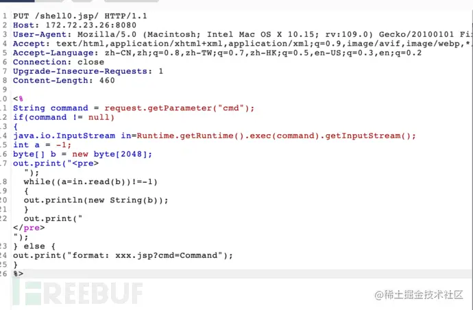 1. 访问http://172.72.23.26:8080,地址是一个Tomcatyang li界面。构造PUT请求包,将数据包进行二次url编码。
